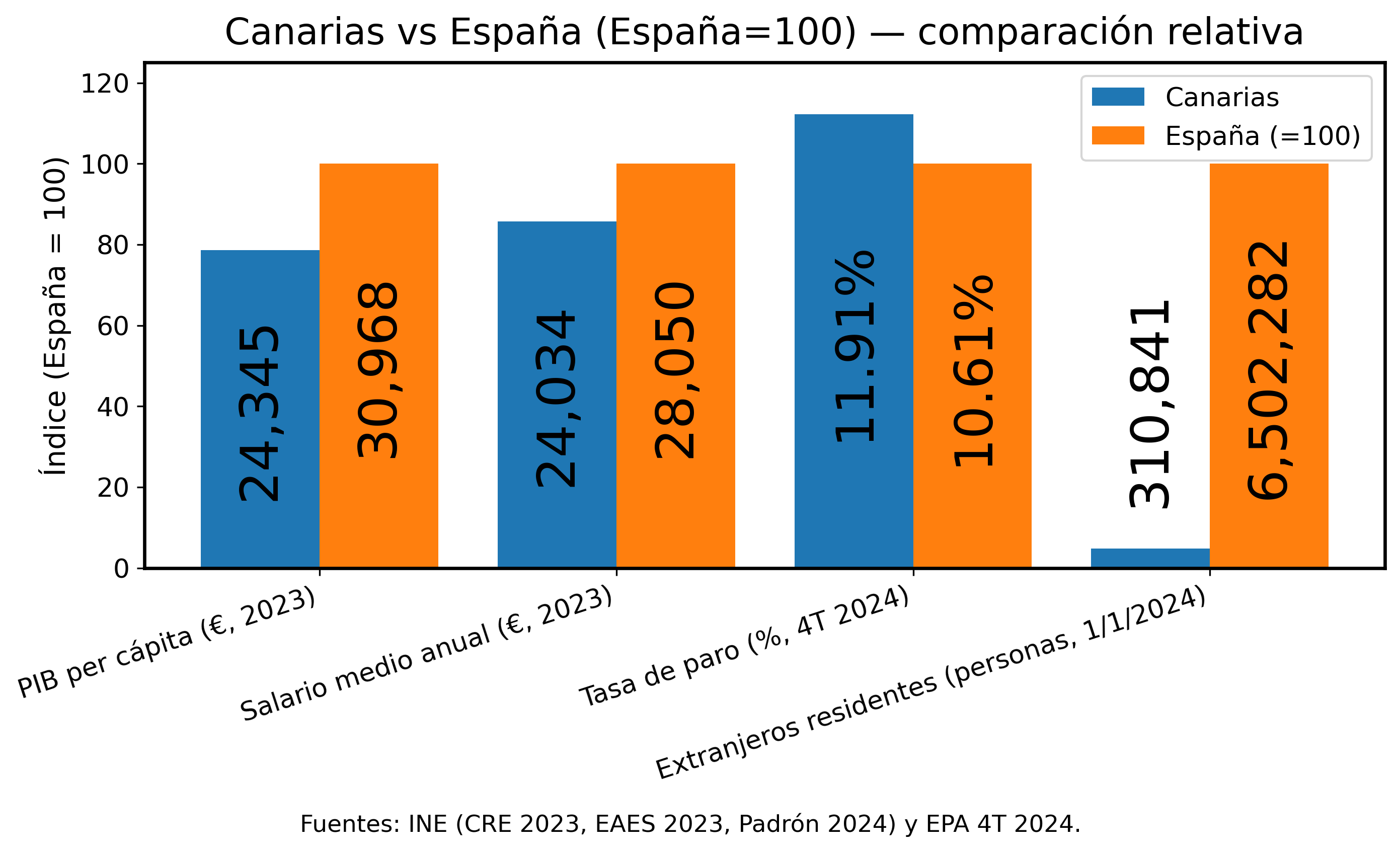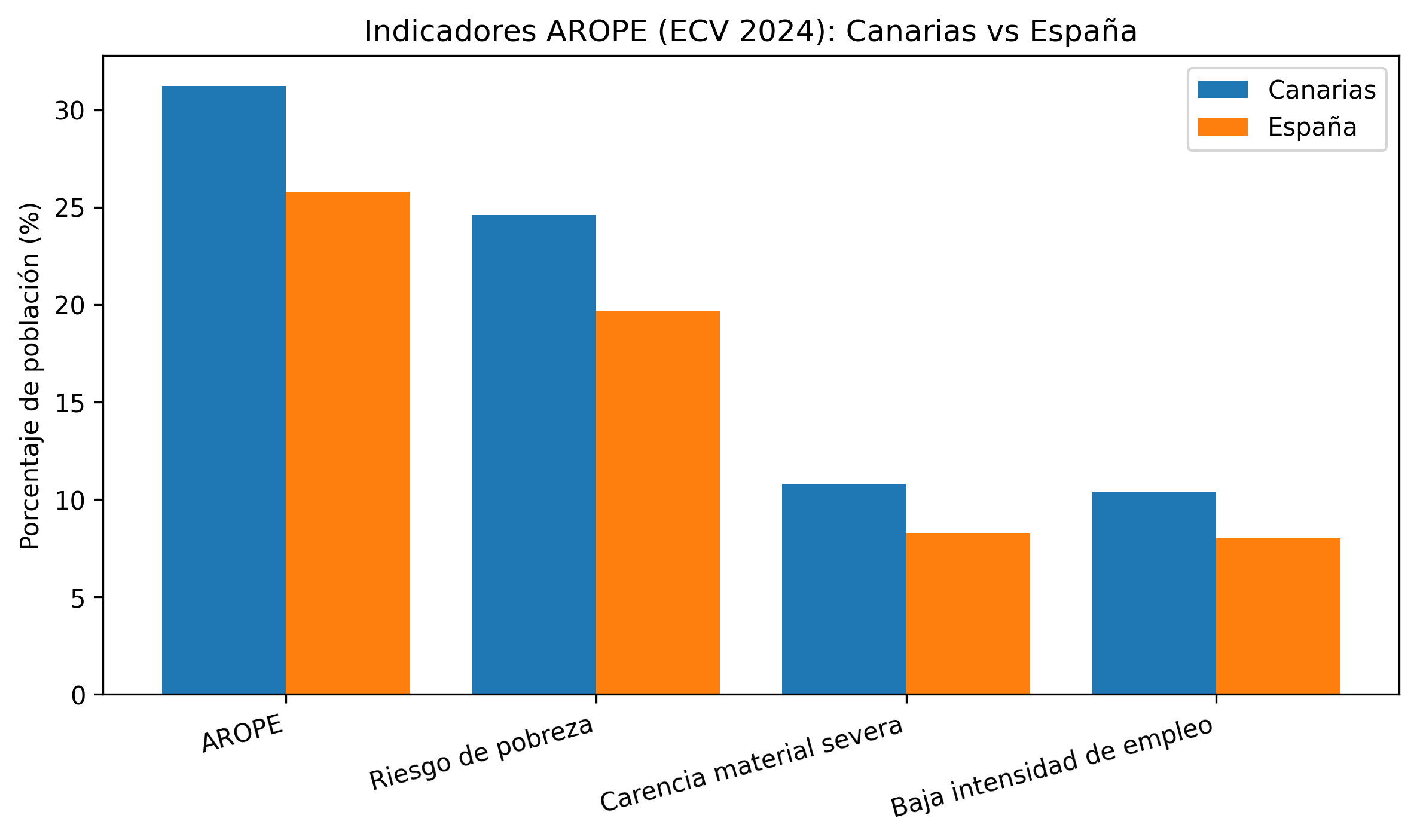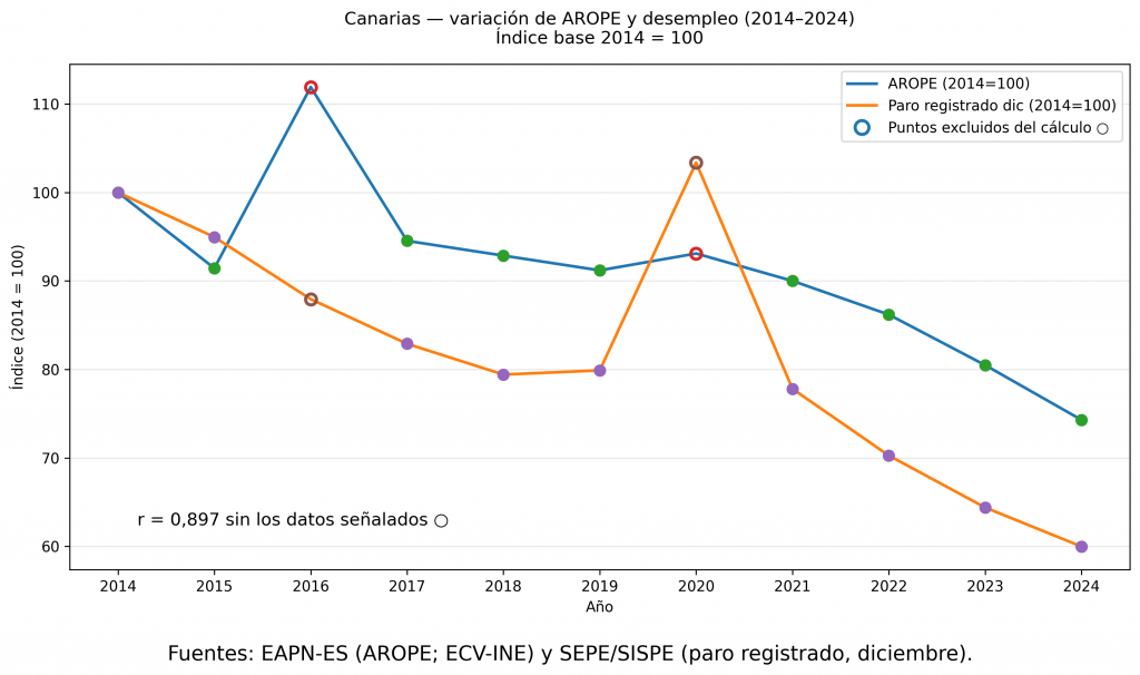 En Canarias, esta relación es evidente desde la mera comparación directa de la variación del índice AROPE y el paro registrado en el Archipiélago, con una correlación lineal (r=0,897) para la serie 2014-2024, excluidos los años singulares 2016 y 2020. Aun considerando que son datos simultáneos a la existencia de 146.293 parados y 125. 059 extranjeros afiliados (2025) a la Seguridad Social.